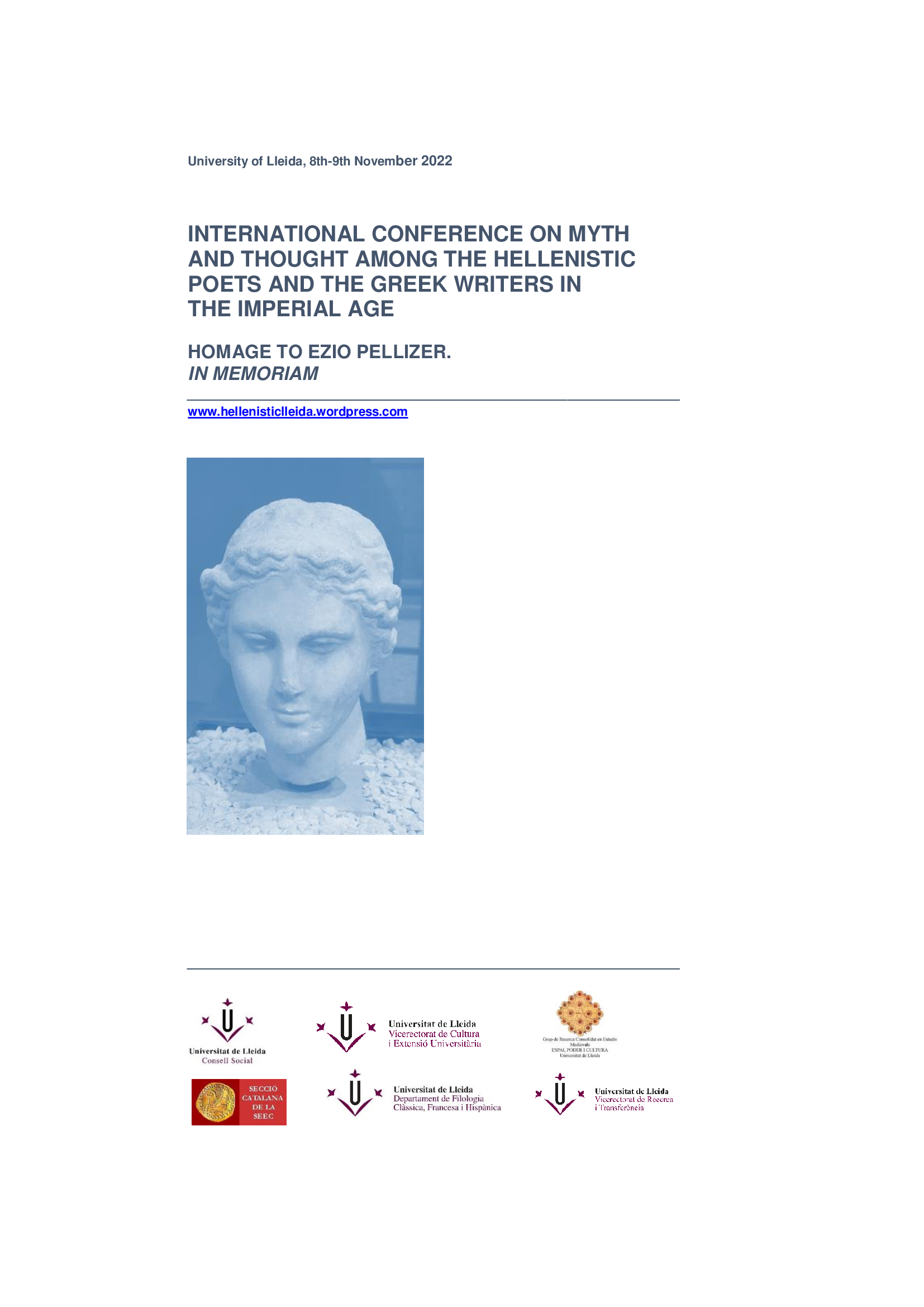 The conference Homage to Ezio Pellizer, In Memoriam, on any subject related to Myth and Thought, or Philological Issues among the Hellenistic poets and the Imperial Greek Literature, taked place at the University of Lleida – Campus of Cappont and the Rectorat building / Faculty of Letters – on 8th and 9th November 2022. It was organized by the ancient Department of Classics, French and Hispanic Philology (UdL).