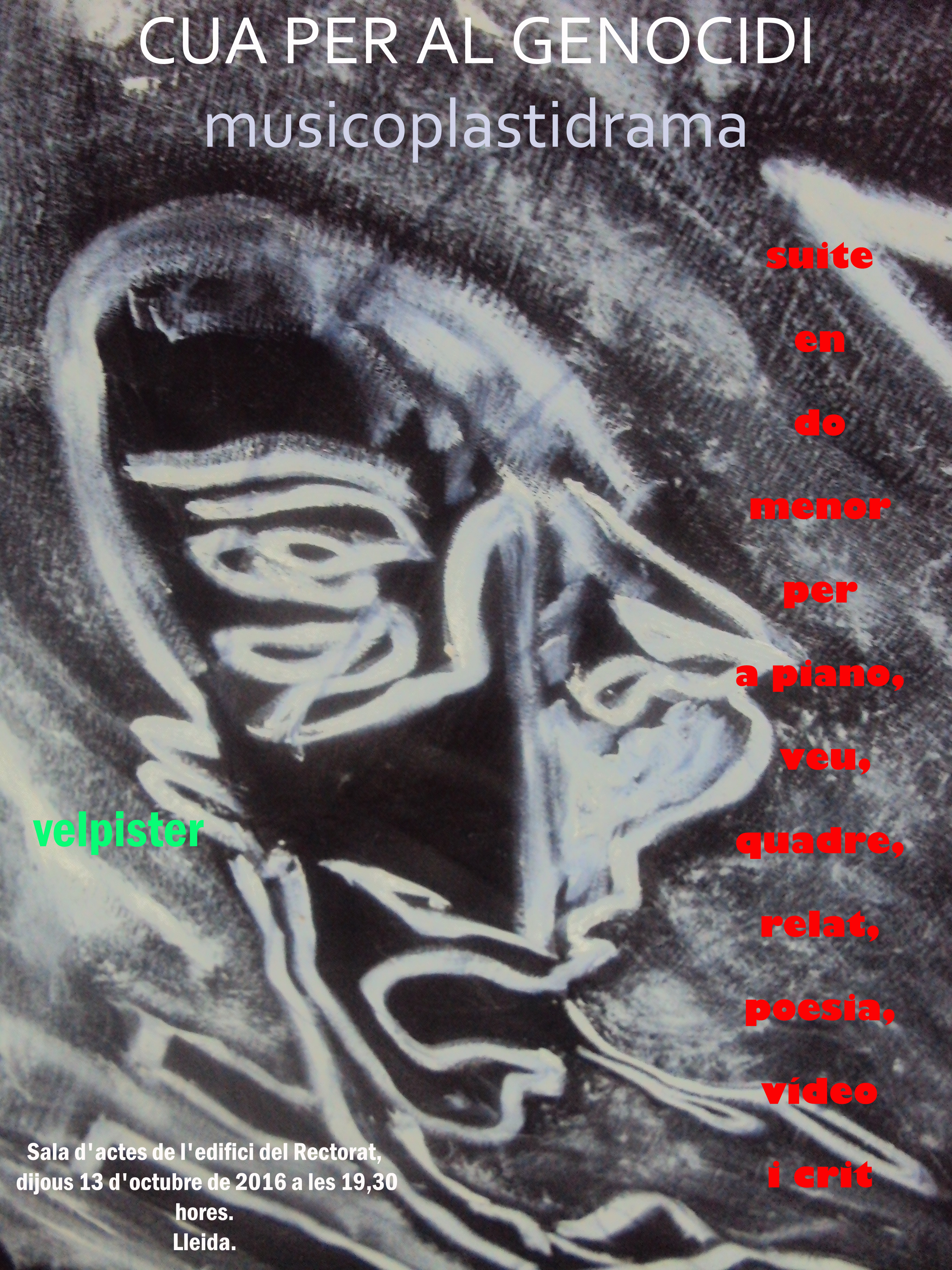 L’artista polifacètic Velpister va presentar a la UdL el seu darrer treball: Cola para genocidio (musicoplastidrama), una suite de piano interpretada en directe per l’artista al temps que recita poemes del seu darrer llibre acompanyant-los amb projecció d’imatges (cuadres i dibuixos de l’autor). Més informació: http://velpister.blogspot.com